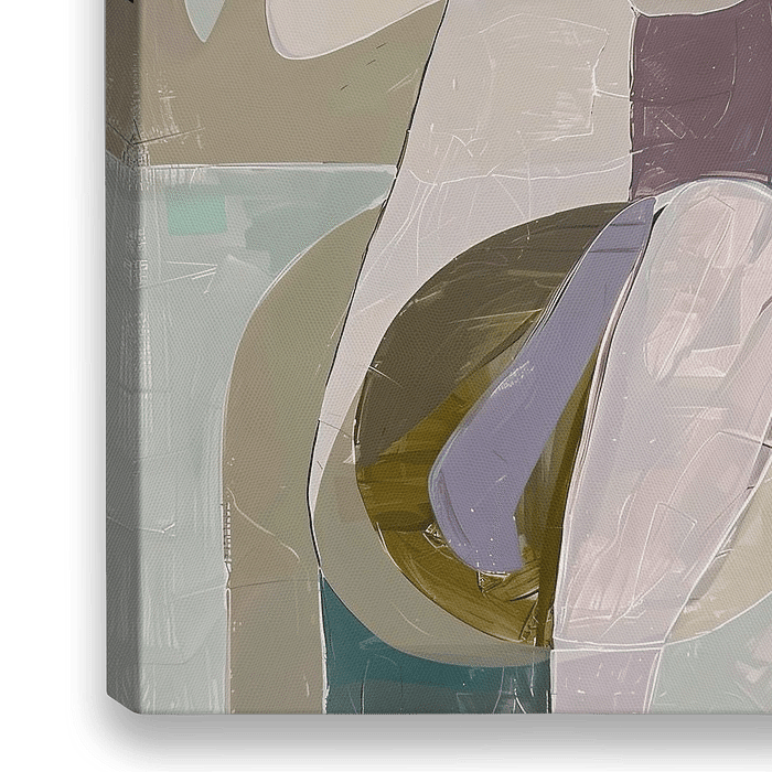 Dit abstracte schilderij toont een ingetogen, serene afbeelding van een vrouw die zichzelf omarmt in een reflectieve houding.