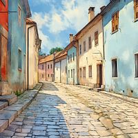 Stille Straat | Straat Zonlicht - Dit schilderij toont een schilderachtige straat met traditionele huizen en een kasseienweg, badend in zacht zonlicht dat warme schaduwen werpt. De stijl is enigszins impressionistisch met een toegankelijke charme, met rustige blauwe en oranje tinten die een vredig, bijna tijdloos tafereel creëren.