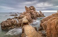 De foto toont een ruige kustlijn met verweerde rotsen die als machtige wachters uit de zee oprijzen. Een smal, stenen pad slingert zich door de rotsformatie en leidt de blik van de kijker naar de horizon, waar de zee en lucht elkaar ontmoeten. De sfeer is melancholisch en tijdloos, versterkt door de dreigende grijstinten in de lucht en…