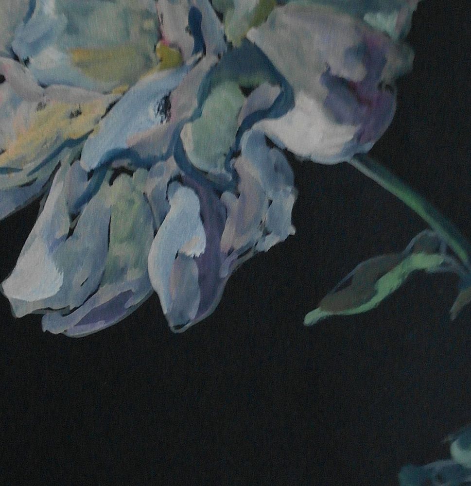Deze sfeervolle tekening toont een delicate witte roos die zacht oplicht tegen een diepe, donkere achtergrond. De subtiele penseelstreken en nuances in lichtblauw, zacht paars en wit geven de bloem een bijna dromerige, schilderachtige uitstraling. Het contrast met de donkere achtergrond versterkt de elegantie en puurheid van de roos,…