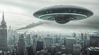 Op de achtergrond is in de verte een rookkolom te zien die mogelijk duidt op een dramatische verandering of vernietiging. De stad, waarvan de architectuur doet denken aan beroemde metropolen als New York, lijkt gevangen in complete stilte, alsof ze wacht op de volgende onzekere gebeurtenis. Er wordt een griezelige spanning gecreëerd tussen het schijnbaar stille maar dreigende ruimteschip en de stad eronder. De details van het beeld nodigen de kijker uit om na te denken over de naderende ontmoeting en de mogelijke gevolgen voor de mensheid.