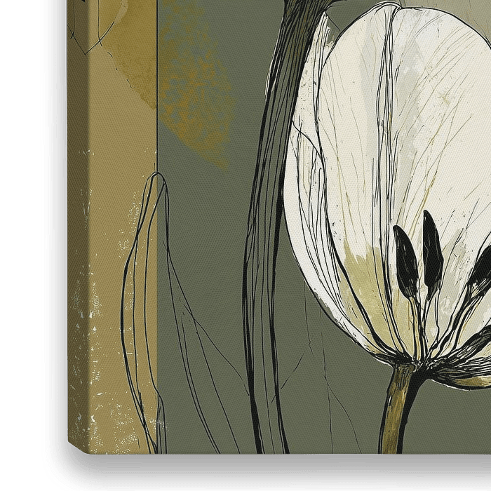 Sierlijke en gestileerde weergave van twee bloemen, subtiel getekend tegen een achtergrond van aardse tinten zoals olijfgroen, beige en oker. De bloemen lijken op tulpen of krokussen en zijn uitgewerkt met fijne zwarte lijnen die doen denken aan een botanische illustratiestijl. Hun bloemblaadjes zijn wit met grijsgroene schaduwen, wat…