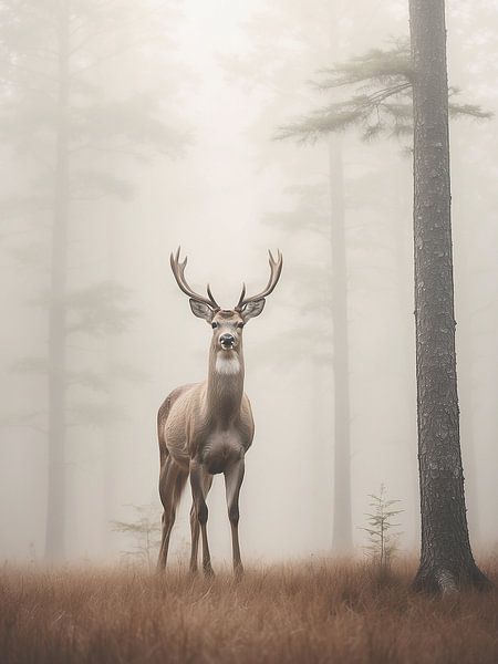 Een rustig Scandinavisch hert staat in een stil mistig bos en creëert een vredige sfeer geïnspireerd op de Scandinavische natuur.