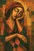 Een abstracte figuur rust in zichzelf, omgeven door een geometrisch mozaïek van warme aardse kleuren. De kubistische afbeelding geeft het moment van stilte een tijdloze diepte.