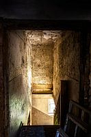 Deze verlaten trap leidt naar de diepten van een vervallen gebouw, waar het licht nauwelijks de muren bereikt en de sfeer wordt gekenmerkt door verval en vergetelheid. De muren zijn bedekt met afbladderend pleisterwerk dat in dikke lagen afbrokkelt en sporen achterlaat van een lange periode van onbruik. Het daglicht dat door een klein raam de kamer binnenvalt, zorgt voor een schril contrast en benadrukt de ruwe texturen van de muren, die zich voordoen als een canvas van vergankelijkheid. De sfeer is zwaar, bijna beklemmend, en de kijker voelt de verhalen die deze plek in zich draagt.