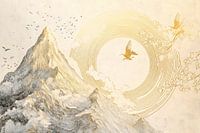 Dit kunstwerk geeft op subtiele wijze de verbinding tussen natuur en stilte weer. De bergen, afgebeeld in gedetailleerde lijnen, worden omlijst door een groot gouden element en vergezeld door vogels die gracieus over de toppen zweven. Deze verfijnde print brengt elegantie en een natuurlijke rust in je ruimte.