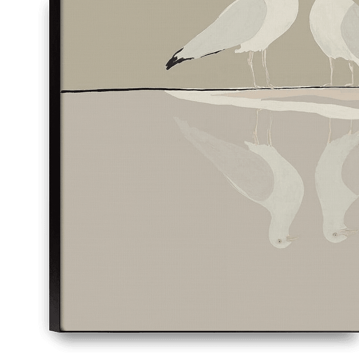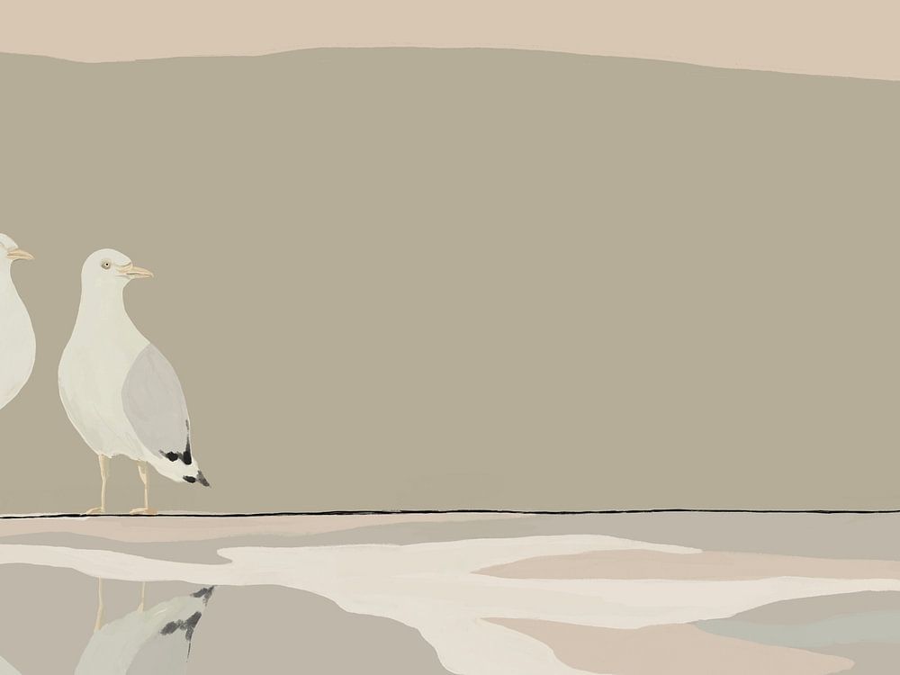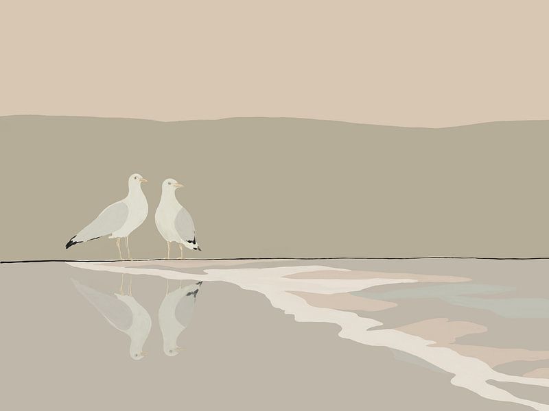 Minimalistisch kustkunstwerk met twee meeuwen die aan de waterkant staan, met zachte reflecties en gedempte neutrale tinten.