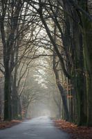 Je kijkt een laan in die zich langzaam opent. Hoge bomen vormen een zacht gewelf boven het pad, hun stammen donker tegen het bleke licht van de ochtend. In de verte lost alles op in nevel. Twee kleine silhouetten verdwijnen bijna in die waas, alsof afstand hier iets tijdelijks is.