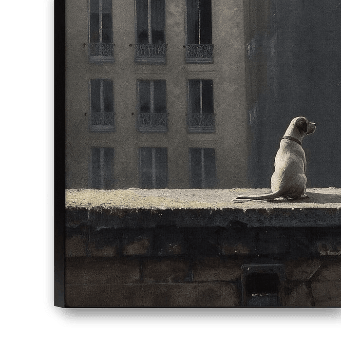 Dit schilderij legt een diep introspectief moment vast, waar de uitgestrektheid van de stad contrasteert met de intimiteit van gezelschap. Als kunstenaar wilde ik de stille band overbrengen tussen mens en hond, die beiden uitkijken over een uitgestrekt stedelijk landschap. De gedempte tinten en korrelige textuur waren opzettelijk en roepen een gevoel van nostalgie en tijdloosheid op, alsof deze scène in elk tijdperk thuishoort.