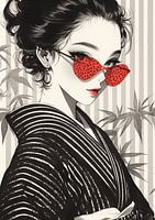 Een vrouw van traditie en trots, gedrapeerd in zwart-witte elegantie, haar karmozijnrode zonnebril symboliseert kracht en onafhankelijkheid.