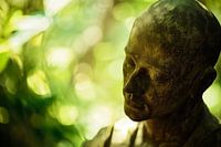 Een expressief kunstwerk dat stille melancholie en reflectie belichaamt, vangt het licht op een kunstzinnige manier. De mysterieuze achtergrond van zachte groene tinten versterkt de kalme aanwezigheid van de sculptuur, die harmonieus past in een slaapkamer of rustige leeshoek en aanzet tot dromen.
