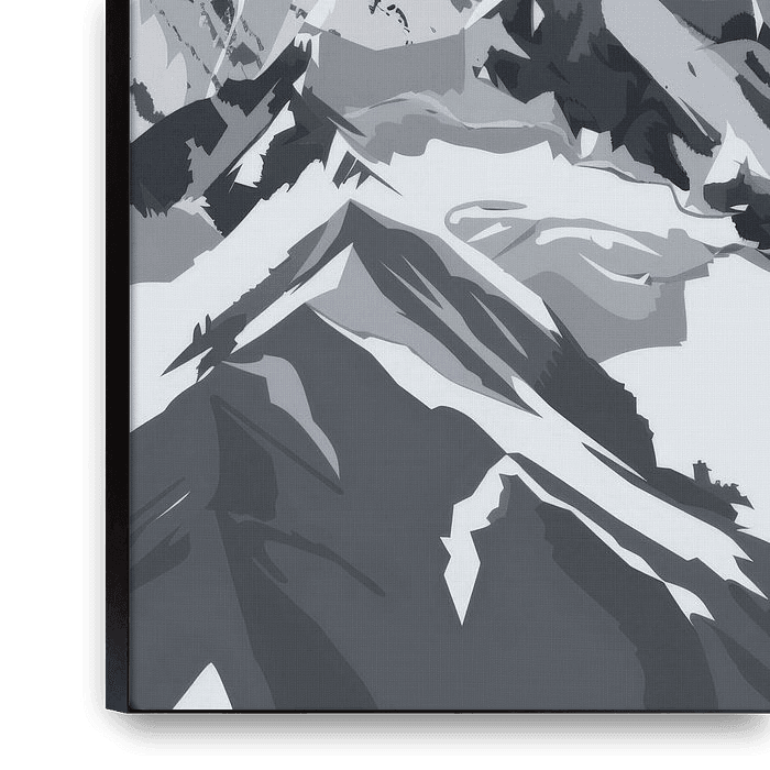 Een majestueuze piek rijst trots op in de grijze lucht, omringd door besneeuwde hellingen. De gedurfde, geometrische lijnen en contrasterende schaduwen geven de scène een dramatische diepte. Een stille getuige van de natuur die zowel rust als uitdaging uitstraalt en de kijker meeneemt naar de wildernis.