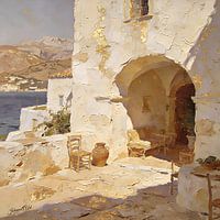 Een zonovergoten mediterrane binnenplaats ontvouwt zich met rustige elegantie, omlijst door een ruwe, gestructureerde stenen boog die uitkomt op een schemerig verlicht interieur. Op de voorgrond staat een eenvoudige houten stoel naast een aardewerken pot op de oneffen, zonovergoten grond, waarvan de oppervlakken zachtjes gloeien in het…
