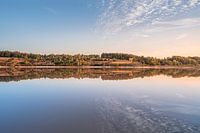 Het stille water van het meer zorgt voor een fraaie reflectie van het prachtige heuvelachtige heide landschap. Het zachte warme licht van de opkomende zon zorgt voor fraaie kleuren in het werk. De wolken boven het meer zorgen voor een fraaie dieptewerking. Het werk heeft een hele warme en serene sfeer.