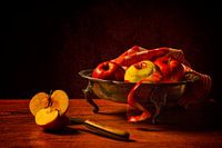 Appels in een tinnen fruitschaal met ernaast een paar stukken en een mes op tafel.