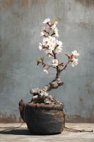 Een bloeiende bonsai in volle pracht, met zachte roze bloemen en een robuuste pot van ruw materiaal. De texturen springen eruit, en de fijne bloesems vormen een fraai contrast met de aardse elementen.