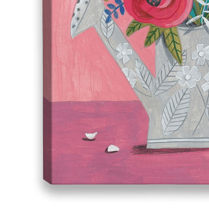Een kleurrijk vrolijk pastel abstract boeket met rode rozen en andere veldbloemen. Dit alles is gerangschikt in een leuke gieter met bloemen versiering. De tafel en de achtergrond zijn in twee roze tinten. Origineel acrylverf op papier.