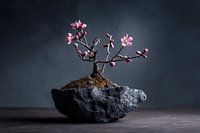 De combinatie van zachtroze bloesem en een turquoise muur geeft deze afbeelding een frisse en energieke uitstraling. De bonsai staat stevig in de aarde, terwijl de bloesems dansen in het licht.