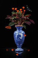 Stilleven verticaal van een bloeiende Calathea in een Delfts blauwe vaas van Villeroy en Boch tegen een zwarte achtergrond en zwarte tafel waarin de vaas weerspiegeld wordt. Er vliegt een vlinder en een tweede vlinder zit op een blad van de Calathea. De Calathea bloeit met fel oranje spitse bloemetjes
