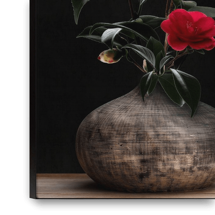 Koop dit bloemen kunstwerk Stilleven Camellia in vaas van Klaartje Majoor op canvas, aluminium dibond, (ingelijste) fotoprint, behang en ArtFrame, op maat geprint in Fine-Art kwaliteit.
