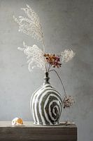 Stilleven verticaal van een porseleinen vaas / kruik met smalle tuit van Fons Crébolder met daarin 3 riet-pluimen en 2 verdroogde hortensia’s op een vergrijsde houten tafel met een slakkenhuis. Alles tegen een grijze neutrale achtergrond.