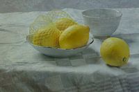 Stilleven horizontaal foto collage van een aardewerk schaaltje met citroenen erin op een grijs geblokte theedoek samen met een losse citroen en een grijs kommetje