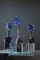 Stilleven verticale foto van 3 blauwe hyacinten in eenvoudige vierkante blikjes op een vergrijsd tafelblad met bubbeltjes plastic. Tegen een grijze achtergrond.