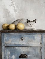 Stilleven: De kat en de citroenen. Een bijzondere blikvanger voor je interieur in zachte kleurtinten. Kies zelf het formaat en materiaal bij dit werk en maak het helemaal naar wens.