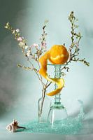 Stilleven verticale foto van een glas met daarop een half geschilde sinaasappel en daarachter een flesje met een takje bloesem dat ik vond aan een bloesemende boom. Alles op bubbeltjesplastic tegen een groenige achtergrond
