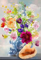 Stilleven verticale foto-collage van een potvaas met deksel van Villeroy en Boch met daarbij een grote schelp. Op een grijsblauwe houten tafel. In de vaas een boeket van onder andere pioenroos, tulpen boterbloemen eikenbloesem en blauwe druifjes. Alles tegen een lichte wolkige lucht.