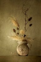 Een landelijk stilleven met de rietpluimen en kaardenbollen.