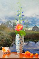 Stilleven met Delfts blauwe vaas Delphinium en pioenroos op een houten tafel. Met daarop verder abrikozen een grote schelp en een blauw linnen doek die de overgang maakt naar het water van een poel vlakbij een watermolen.