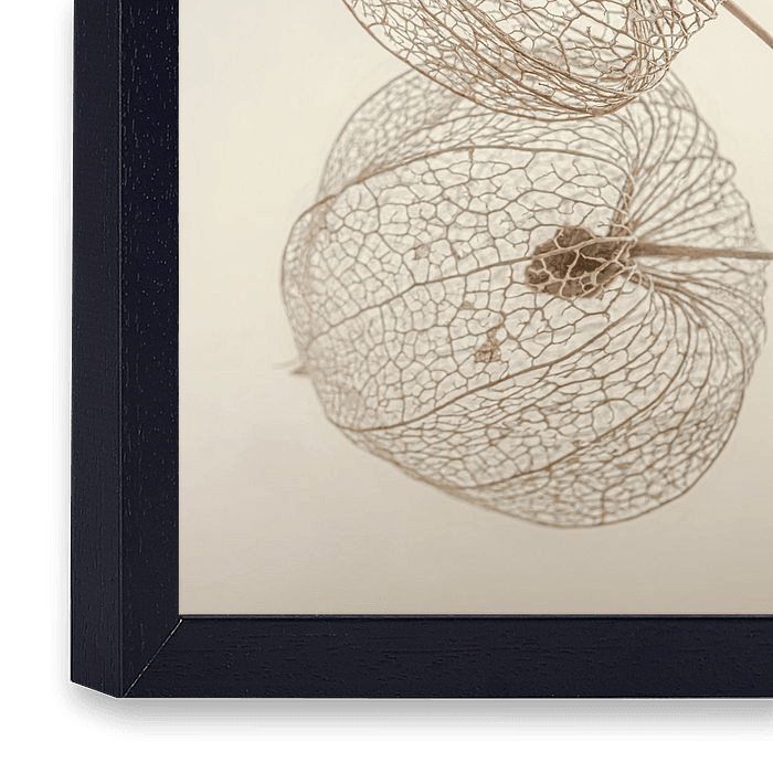 "Stilleven: Een lampionnetje van de lampionplant" is een foto van een lampionnetje van de lampionplant die al bijna verteerd is. Het geraamte van de nerven is hierdoor mooi te zien. Op de grijs - zilveren beige kleurige ondergrond is de reflectie te zien van het lampionnetje. Door onder andere de zachte lichte natuurlijke kleuren krijgt het geheel een rustige uitstraling.