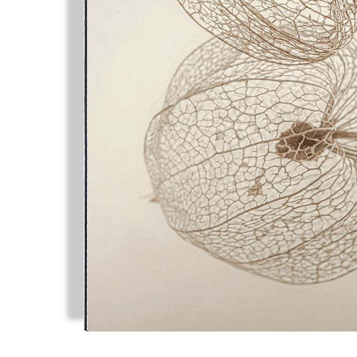 "Stilleven: Een lampionnetje van de lampionplant" is een foto van een lampionnetje van de lampionplant die al bijna verteerd is. Het geraamte van de nerven is hierdoor mooi te zien. Op de grijs - zilveren beige kleurige ondergrond is de reflectie te zien van het lampionnetje. Door onder andere de zachte lichte natuurlijke kleuren krijgt het geheel een rustige uitstraling.