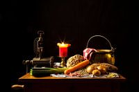 Een tafel vol benodigheden om een ketel erwtensoep te maken. Te weten: Koperen ketel, uien, wortel, prei, selderij, erwten, spek en een oude vleesmolen.