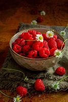 Stilleven foto verticaal van een beige kom met daarin frambozen. Op een beige linnen servetten met madeliefjes rondgestrooid op een donkere ondergrond