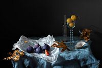 Stilleven horizontale foto van verse vijgen op papier met daarbij een glas op een hoge poot met 3 witte pruimen, een flesje en 3 herfstbladeren (vijgenblad) Alles op een blauw linnen doek tegen een donkere achtergrond