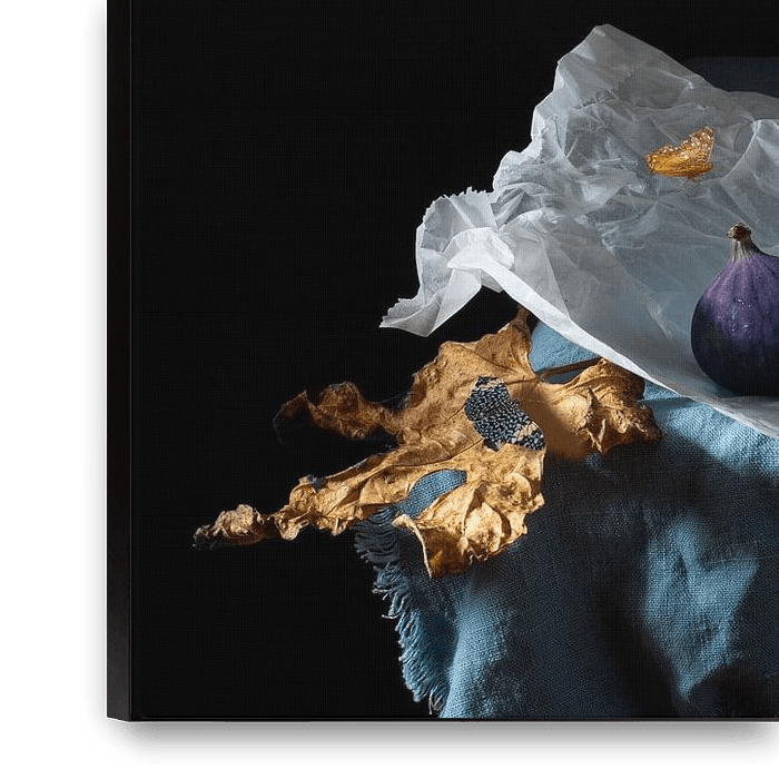 Stilleven horizontale foto van verse vijgen op papier met daarbij een glas op een hoge poot met 3 witte pruimen, een flesje en 3 herfstbladeren (vijgenblad) Alles op een blauw linnen doek tegen een donkere achtergrond