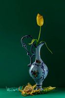 Stilleven verticale foto van een ranke blauwe kan met oor, met een gele tulp en een exotische schelp op een organisch blad tegen een groene achtergrond.