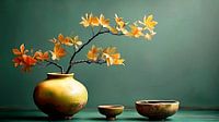 Een natuurlijk en rustig stilleven van een tak van de Japanse esdoorn in een aarden vaas in warme kleurencombinatie.