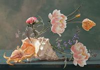 Stilleven horizontale foto-collage van 2 grote speciale schelpen op een zeegroene tafel met pioenrozen een tulp en wilde bloemetjes. Tegen een wolkige groenblauwe achtergrond