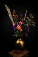 Boeket bloemen in diverse kleuren in een gouden vaas met een zwarte achtergrond