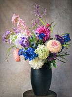 Foto van een boeket kleurrijke bloemen in een hoge zwarte vaas. Foto is gemaakt in studio. Daarna digitaal bewerkt tot een modern stilleven. Lichtinval vanaf linksboven.