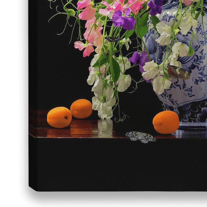 Stilleven verticaal foto-collage van een grote Delftsblauwe vaas met deksel met daarin Lathyrus op een donkere houten tafel met abrikozen. Als je goed kijkt zie je vlinders.
