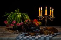 Stilleven: Lunch met druiven, tulpen, brood, noten, vijgen en fruit.