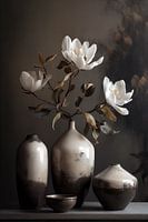 Stilleven met vazen en magnolia bloemen in matte bruin tinten.