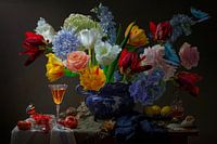 Uitbundig stilleven van tulpen rozen hortensia’s en Delphinium in een hele grote Delftsblauwe pot van Villeroy en Boch. Op tafel met rode bessen in een kristallen schaaltje daarnaast een kristallen glas met likeur. Schelpen liggen her en der en rechts achteraan liggen citroenen op een blauw bordje. Chiaroscuro