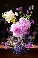 Stilleven verticale foto van een kristallen vaasje op zilveren voet met daarin rozenpioenrozen, een witte bloem en wilde bloemen. Op een oud houten schaaktafeltje met een bos lavendel en een glazen karaf. Alles tegen een donkere achtergrond waarin je vaag bloeiende pioenrozen ziet. Het geheel is gefotografeerd in de traditie van de oude Hollandse meesters in koele paars en roze tinten tegen een donkere achtergrond. Clair obscur.