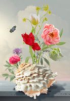 Stilleven verticale collage van een grote oester op een grijsblauwe tafel met daarachter een bescheiden compositie van pioenroos tulpen en wilde bloemen zoals koolzaad. Alles tegen een wolkige lucht.