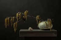 Stilleven, foto, horizontaal, kunst. Van een raku gestookte vaas van keramiste Carla Teer met daarin een eenvoudige hangende tak van een elzenboom. De laatste overblijfselen van vorig jaar en nieuw knopjes die ontluiken. De vaas op een dik houten tafelblad samen met een schelp. Alles tegen een donkere achtergrond.